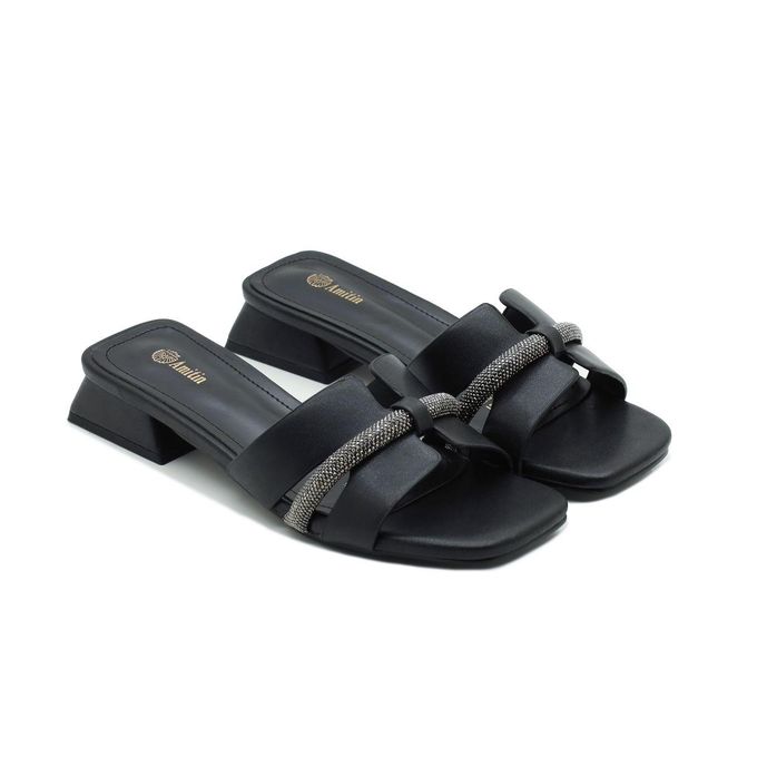 The sandals feature a square toe design, low block heels, and a decorative knotted strap embellished with sparkling accents. They have a refined, classy look, suitable for both casual and semi-formal occasions.